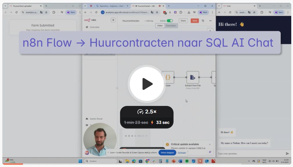 Huurcontracten bevatten veel belangrijke informatie: looptijd, huurprijs, indexatie, borg, partijen, en meer. Maar in de praktijk staan deze gegevens vaak opgesloten in een PDF. Voor rapportages of analyses moeten medewerkers die informatie telkens handmatig overnemen – een traag en foutgevoelig proces. Onze oplossing: documenten automatisch uitlezen, omzetten naar gestructureerde data, en direct beschikbaar maken in een AI-chatinterface.