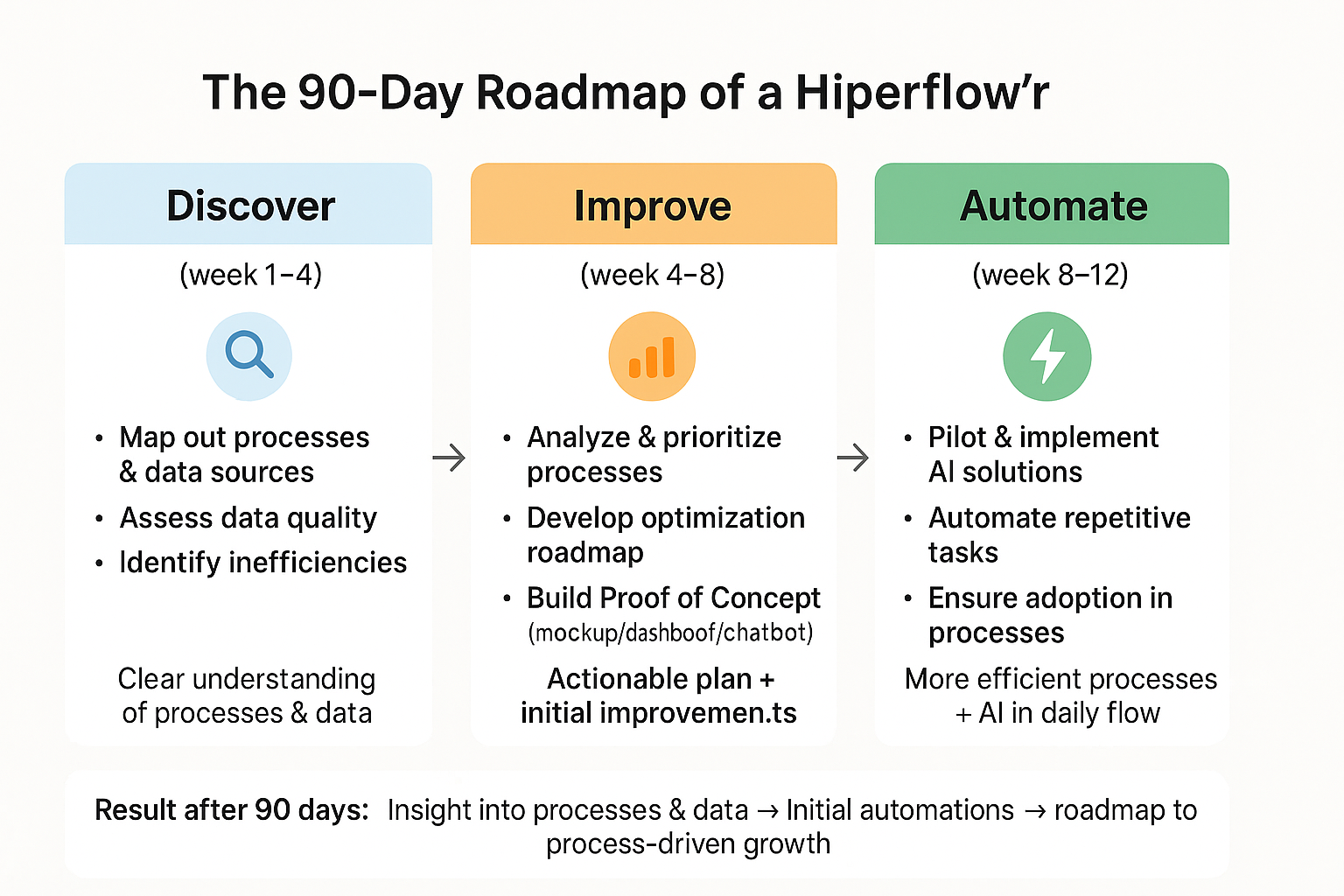 Een Hiperflow’r brengt eerst processen en data in kaart, analyseert en prioriteert verbeterkansen en bouwt een eerste Proof of Concept. Daarna worden AI en hyperautomation geïntegreerd in de dagelijkse flow, zodat processen slimmer en efficiënter lopen en teams direct resultaat ervaren.